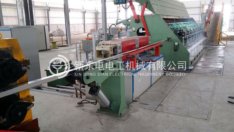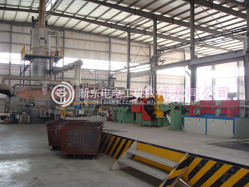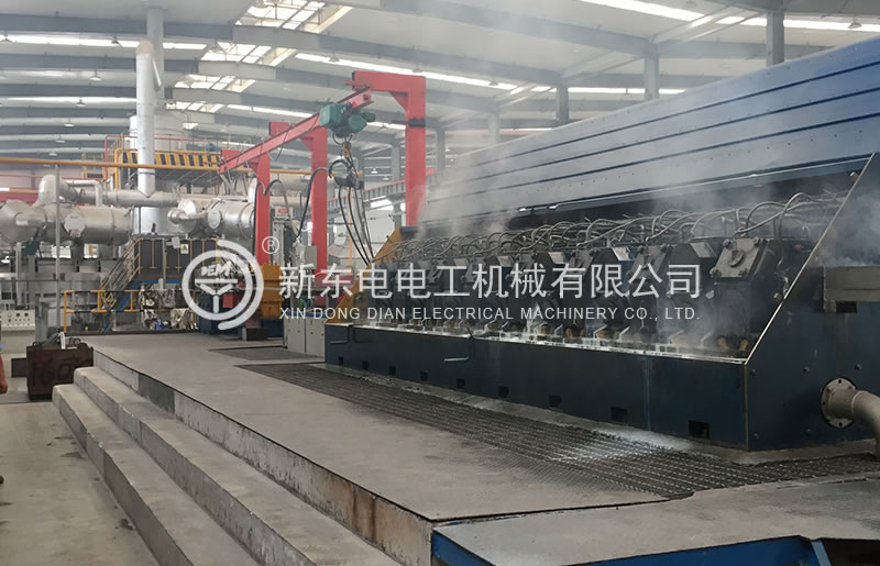 本設備采用新型四輪式連鑄機和連鑄連軋工藝生產¢9.5mm的鋁合金桿 (鋁合金牌號為1系列全部,3系列全部,6系列,8系列),鋁合金桿生產中,感應加熱器保證鑄坯進軋的工藝溫度要求,具有鑄錠加熱調節功能,連軋機具有主動喂料和堆桿停車功能,連續淬火裝置有在線淬火功能,收線導管出口處裝有吹水裝置,以清除鋁合金桿表面水分,同時安裝有主動牽引裝置,保證鋁合金桿的順利導出。圓弧導向管采用滾輪導向結構,減少鋁合金桿表面擦傷。繞桿方式為離心甩頭式,一方面使鋁合金桿在進入收線框前給予預變形;另一方面使其在軋制過程中若發生斷桿,桿尾能自動到收線框內。使其換盤時不亂桿,以保證連續雙盤成圈裝置進行收線。